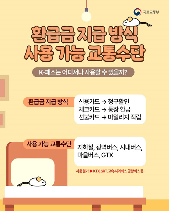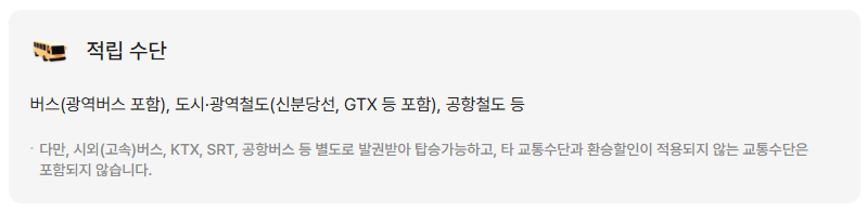 - 사용 불가능 교통수단: 아쉽지만 KTX, SRT, 고속·시외버스, 공항버스 등은 사용할 수 없답니다.