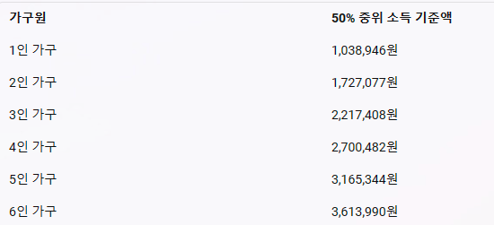 소득인정 금액이 아래 표의 50% 중위 금액보다 적어야 지원대상에 해당합니다.