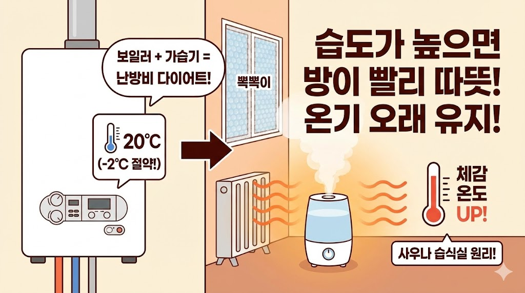 공기 중의 습도가 높아지면 열전도율이 올라가서 방이 훨씬 빨리 따뜻해지고, 그 온기가 오래 유지됩니다.