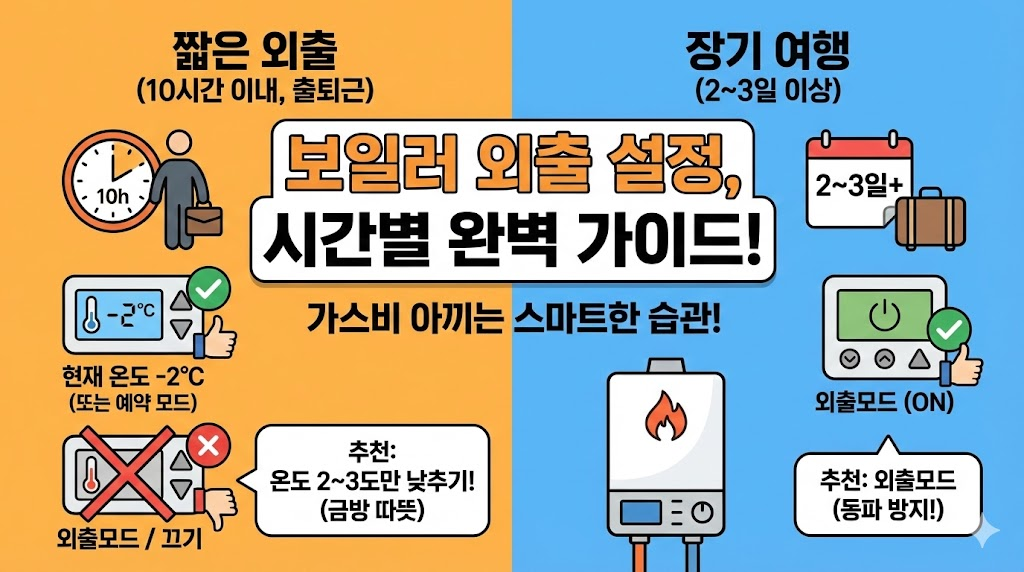 - 이유: 며칠씩 집을 비울 때는 당연히 가스비를 아끼기 위해 온도를 낮춰야 합니다. 이때 '외출모드'는 난방을 위한 것이 아니라, '동파 방지'를 위해 최소한의 온도를 유지해 주는 기능입니다. 이때는 외출모드가 정답입니다.