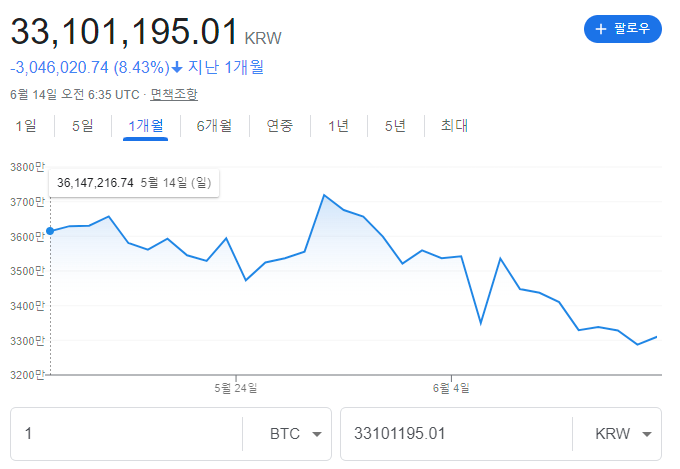 비트코인은 2023년 6월 13일 현재 약 3천3백만원에 거래되고 있으며, 시가총액은 약 5천억달러(약 6천조원)입니다. 비트코인은 최근 몇 달간 3천만원에서 4천만원 사이에서 등락을 반복하고 있으며, 변동성이 높은 상태입니다.