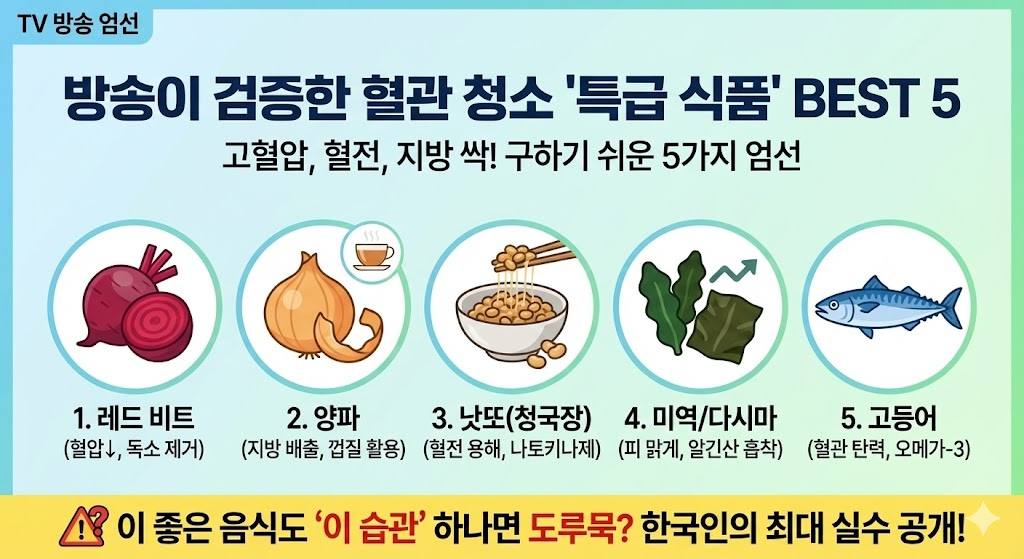 TV조선/MBN 건강 닥터들이 추천한 혈관 뚫어주는 음식 5가지와 절대 하지 말아야 할 아침 습관을 공개합니다.