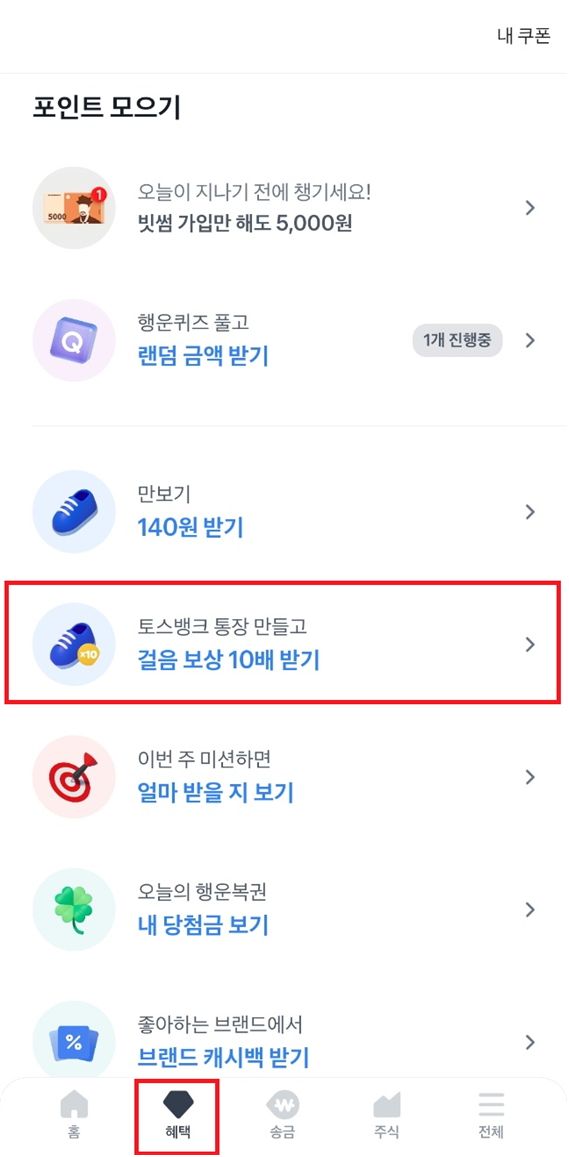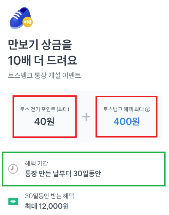 아직 토스뱅크 통장이 개설되지 않았다면 만보기 보상을 10배 받을 수 있습니다.
