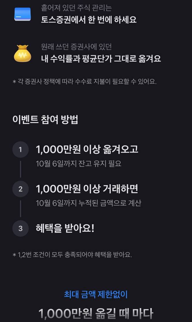토스증권이 주식 옮기기 이벤트를 하고 있습니다. 토스증권으로 주식을 1,000만원 옮길 때마다 혜택을 주는 이벤트입니다.