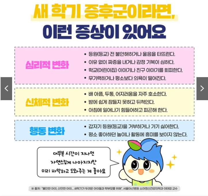 새로운 선생님, 친구, 학습 환경이 낯설기 때문에 불안감을 느끼고, 때로는 신체적인 증상으로도 나타날 수 있습니다.