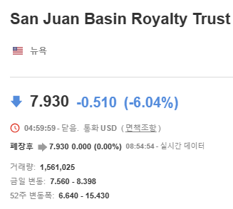 San Juan Basin Royalty Trust의 주식은 뉴욕 증권거래소에서 SJT라는 티커로 거래되고 있습니다. 현재 (23.5.19)는 주당 $7.93 입니다.