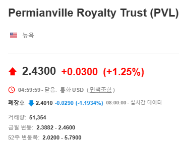 Permianville Royalty Trust의 주식은 뉴욕 증권거래소에서 PVL이라는 티커로 거래되고 있습니다. 현재 (23년 5월 19일) 주가는 $2.43입니다.