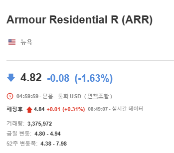ARMOUR Residential REIT Inc의 주식은 뉴욕 증권거래소에서 ARR이라는 티커로 거래되고 있습니다. 현재(23.5.19) 가격은 주당 $4.82입니다.
