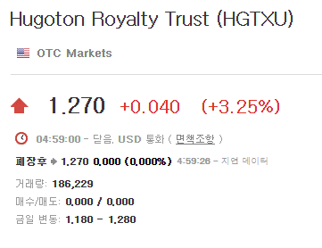 Hugoton Royalty Trust의 주식은 OTCQB 마켓에서 HGTXU라는 티커로 거래되고 있습니다. 현재(23.5.19) 가격은 $1.27입니다. 배당율이 상당히 높지만, 주가는 이를 반영하듯 약간의 문제가 있어 보이는 가격입니다.