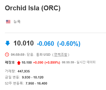 Orchid Island Capital Inc의 주식은 뉴욕 증권거래소에서 ORC라는 티커로 거래되고 있습니다. 현재(23년 5월 19일) 기준 $10.01입니다.