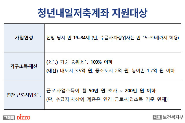 가입연령은 만 19세 ~ 34세의 경우 신청이 가능합니다. 특히 다른 정책들과 다르게 차상위 수급 대상자 및 기초 수급 대상자의 경우에는 만 15세 ~ 39세까지 조금 더 연력폭이 넓게 지원이 됩니다.