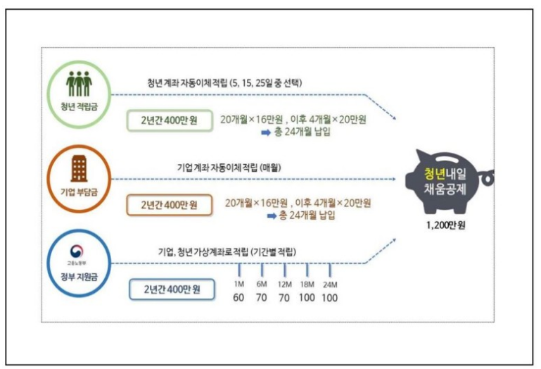 지원내용은 지원 청년이 2년간 400만 원을 적립하면 기업과 정부가 공동으로 각각 400만 원씩 적립하여 2년 후 만기공제금 1,200만 원을 지원받게 됩니다.