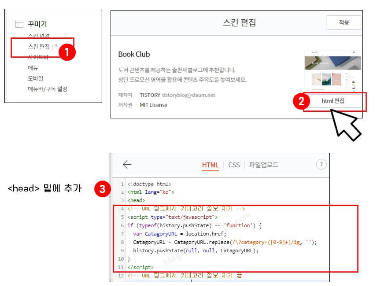 ▶ 꾸미기> 스킨 편집> html 편집을 클릭합니다. 그리고 <head> 밑에 소스코드를 추가합니다.