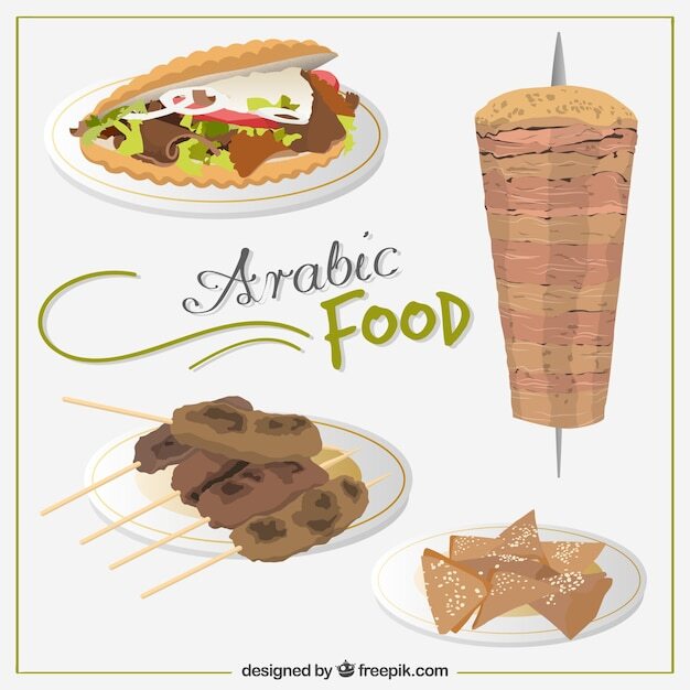 케밥은 전 세계적으로 인기를 얻은 중동 요리입니다. 작은 고기 조각(보통 양고기, 닭고기 또는 소고기)을 향신료로 양념하고 꼬챙이에 꽂아 직화 또는 석쇠에 굽는 요리입니다. 고기는 그 자체로 또는 야채, 소스 및 기타 토핑을 곁들인 랩 또는 피타 빵에 담아 제공할 수 있습니다.