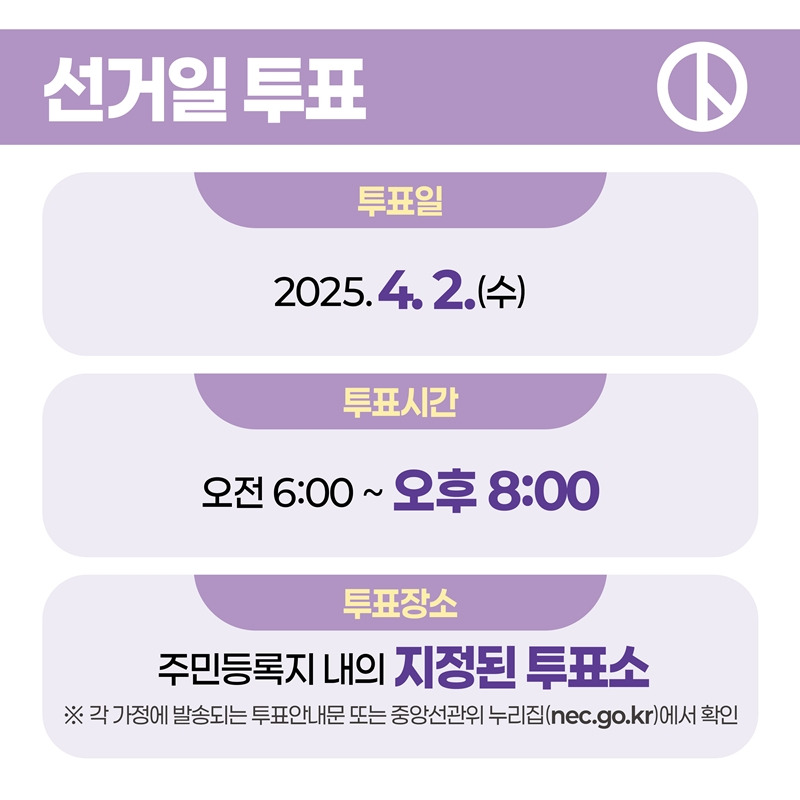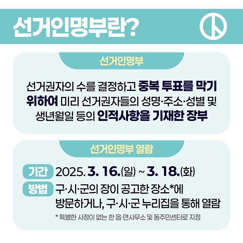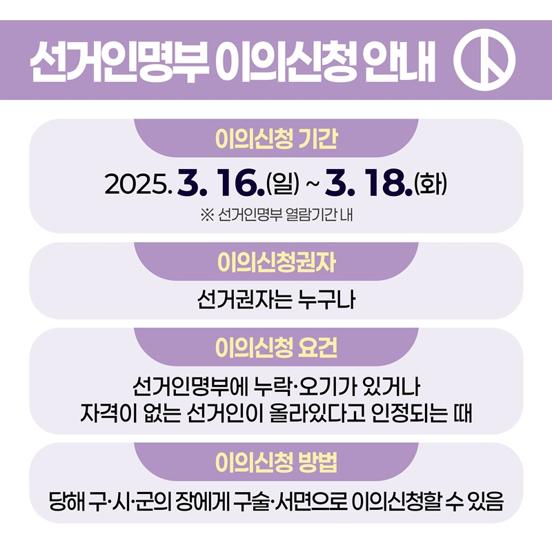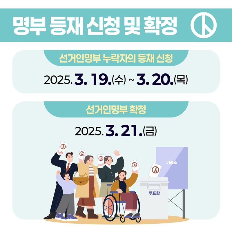 • 신청 기간: 2025년 3월 16일 (일) ~ 3월 18일 (화) (선거인명부 열람 기간 내)