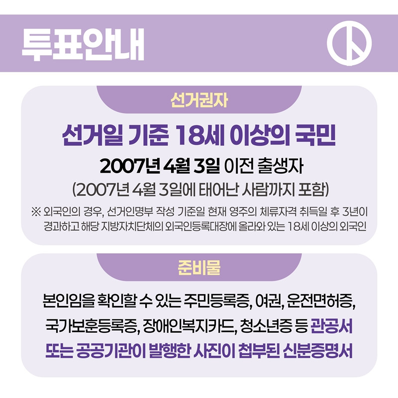 • 외국인: 선거인명부 작성 기준일 현재 영주 체류자격 취득 후 3년 경과 및 해당 지방자치단체 외국인 등록 대장에 등재된 만 18세 이상 외국인
