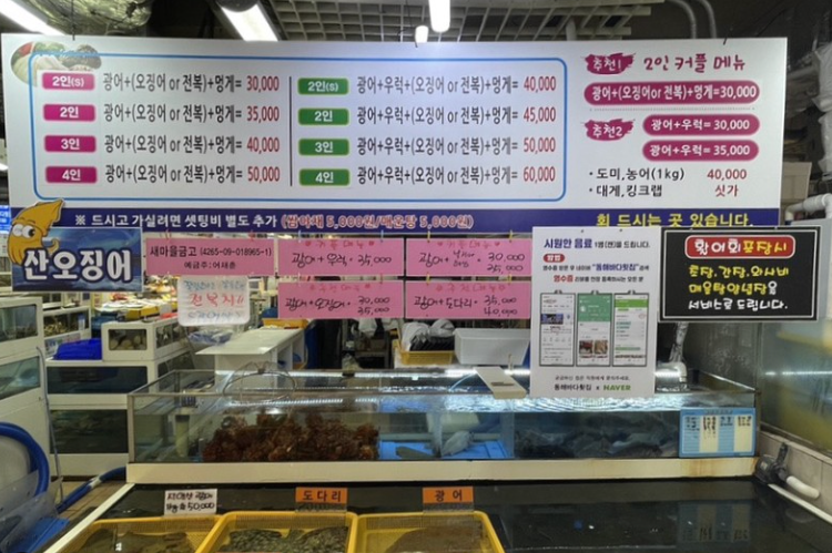 메뉴는 인원수와 종류에 따라 합리적으로 먹을 수 있도록 구성되어 있는 수산시장에서 바로 잡아 식당으로 가는 시스템입니다.